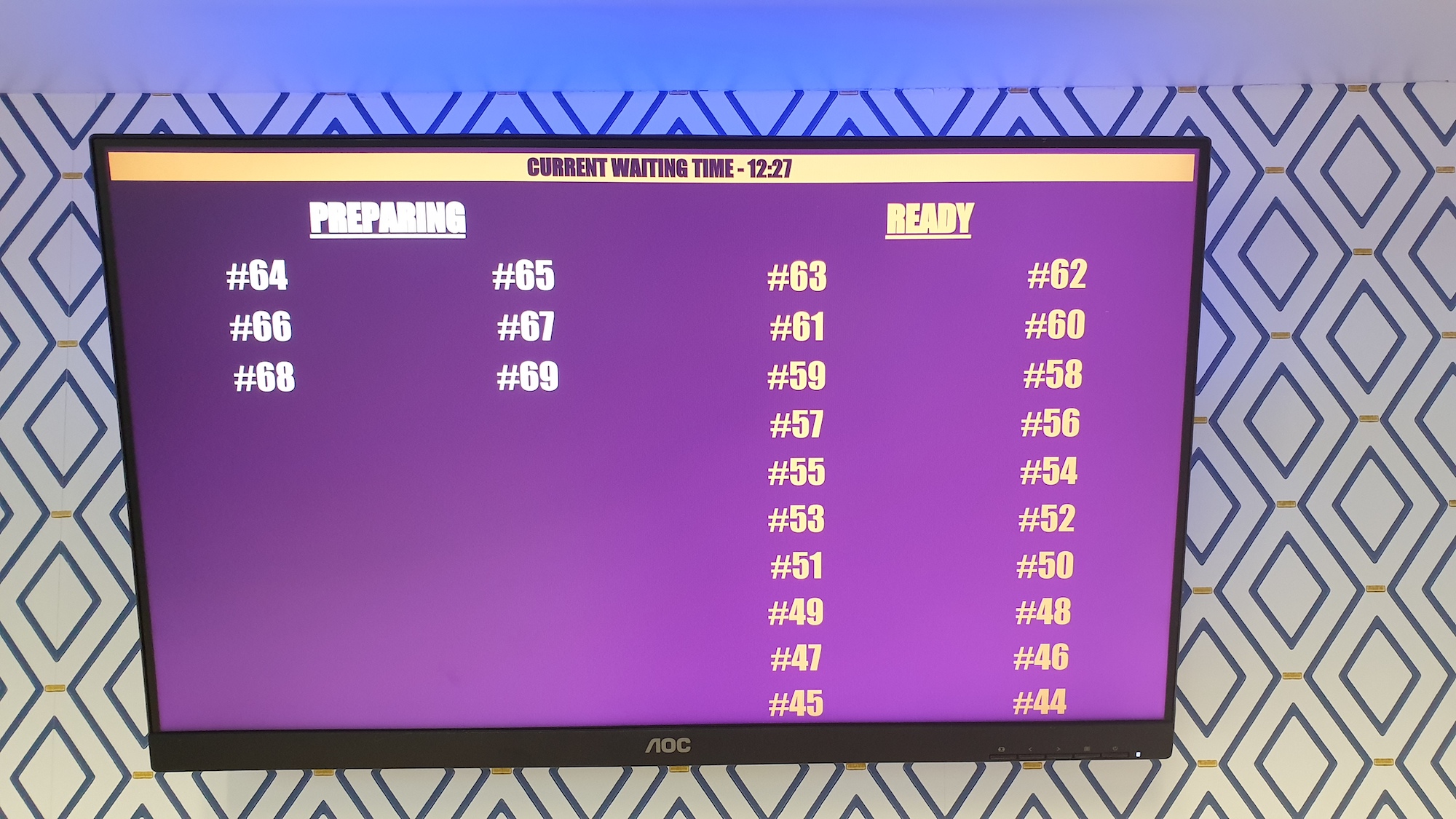 You can display the progress of orders to your customers on a display in the customer waiting area. Let customers know your current expected wait time before they order and let them know when their order is ready. We will even theme the display’s fonts and colours according to your brand making it look great.